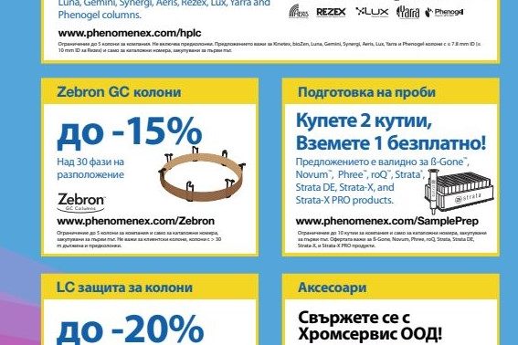 Супер намаления тази пролет! Заредете се и спестете! Осигурете в склада си всички консумативи за да започнете ударно годината! Спестете от различните марки LC и GC колони и продукти за пробоподготовка на Phenomenex! Вижте детайлите тук и се свържете с нас.